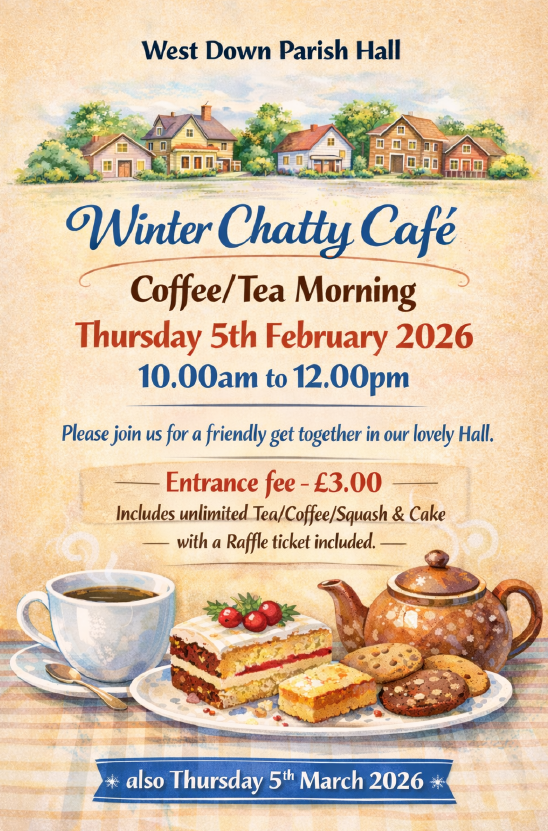 Another successful ‘Chatty Café’ morning held in the West Down Parish Hall on Thursday 4th December which included a Christmas wreath making demonstration.