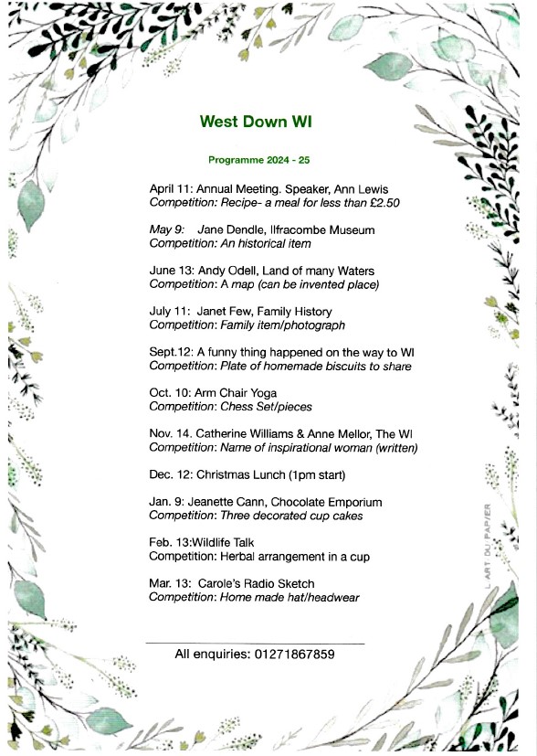 West Down WI are a friendly group who meet monthly in the Parish Hall (2nd Thursday). We have optional craft sessions in the winter and many members take courses run by the Devon Federation.